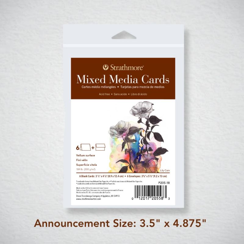 These blank cards are made of 400 Series Mixed Media heavy-weight 184lb. (300gsm) paper. The acid-free paper features the attributes of a watercolor paper but with a vellum drawing finish, making the cards ideal for watercolor, gouache, acrylic, graphite, pen & ink, colored pencil, marker and collage. Each pack includes 6 cards and envelopes. Made in the USA.
