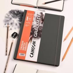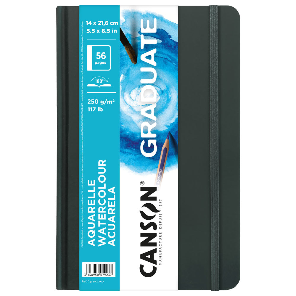 CANSON Graduate Books Sketch & Notes - 61lb/90g - Ideal for quick  sketching or note-taking,  the Graduate Sketch & Notes  book is made of easily  erasable white paper.  Available in three different  colors, with a soft or  a hard cover. Drawing- 98lb/160g - With its light grain, white, resistant paper, the Canson Graduate Drawing book is ideal for precise drawings and sketches with fine details.  Ideal for creative drawings and sketches in charcoal, pastel, pencils and felt pens. Watercolor - 117lb/250g - The Canson Graduate Watercolor Book offers a double-sided white paper with a  fine and light grain, perfect for watercolor painting.  The watercolor paper is resistant to warping when water is applied and is of quality support for all watercolor paint.